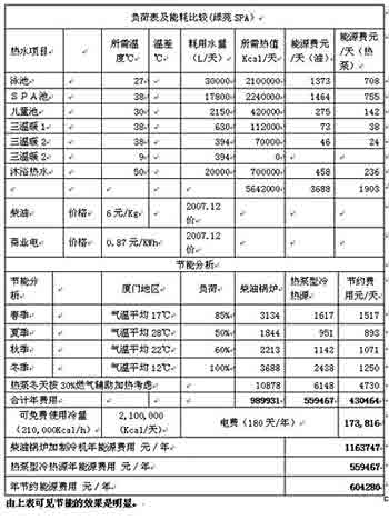 根據廈門海景綠苑活水SPA館項目采用熱泵型冷熱源機組和柴油鍋爐加制冷空調的兩種應用模式進行節能評估如下表: