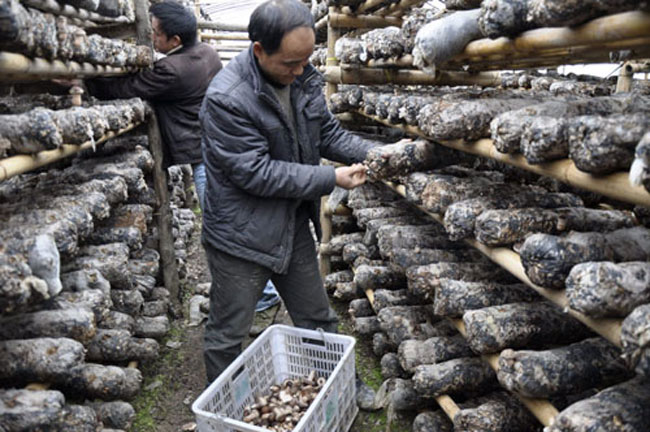 采收前一天禁止?jié)菜?,適時(shí)采收。厚菇應(yīng)在四五成熟時(shí)采收,一般采收均不能超過(guò)八成熟。采收時(shí)應(yīng)選擇香菇菌膜自然破裂,菌蓋尚未開(kāi)傘,邊緣內(nèi)卷,菌褶伸開(kāi)的無(wú)病變、無(wú)畸形的菇體。采收時(shí)要用手指輕輕掐住菌柄扭取,不得碰菌褶,輕拿輕放,積壓不得過(guò)厚。搬運(yùn)或置于竹筐時(shí),應(yīng)避免碰壓變形或破損。剪除菇根,留菇柄長(zhǎng)1-2厘米。分揀花菇、厚菇、薄菇,然后按品種與大小不同分裝于盤(pán)中,在陽(yáng)光下暴曬2-3小時(shí),以去除部分水分。