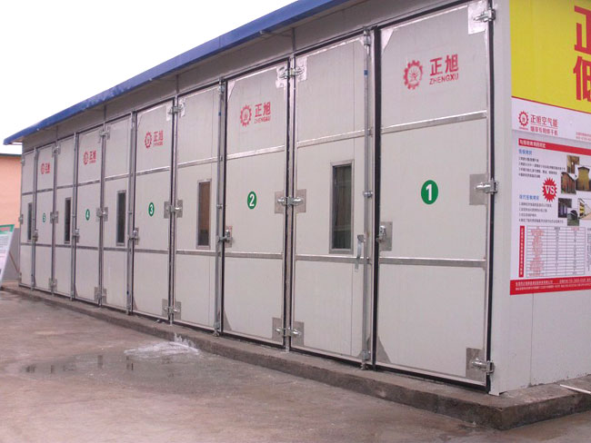 香菇裝盤(pán)后放在烤架上,送入烘干室進(jìn)行烘烤。應(yīng)把大而厚及水分含量高的放上層,小而薄及水分含量低的放下層。一般擺放8至10層。若擺放過(guò)多,則易使上、中、下層的物料受熱溫度不均勻。每層的間距應(yīng)為30厘米。