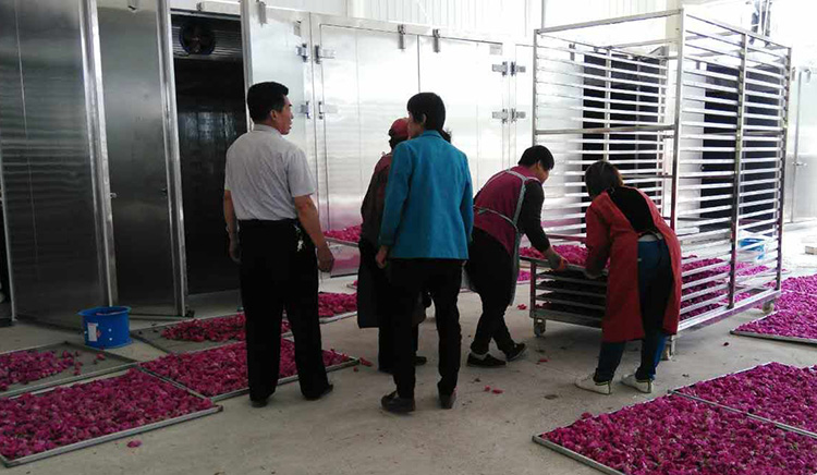 本項目采用6P除濕型烘干機,附帶高效器,配立體360循環風烘干房6套,每個烘房一次裝鮮花800斤,烘干時長22小時,總耗電量198度,單位干品能耗1.5度/斤,均勻性和品相品質較好,升溫及烘干速度快,出水量達35-40%,為客戶提高了附加值。