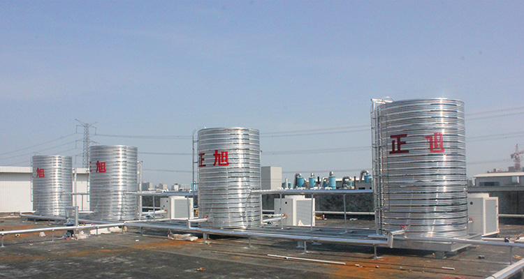 水箱和機組安裝在樓頂,冷熱水管在路面與客戶水管對接。熱泵熱水系統主要由熱泵熱水機組,不銹鋼保溫水箱、循環系統、補水系統、控制系統和管道配件組成。主機安裝正旭熱水機組,儲熱水箱連接熱水管路通向各個用水點。其采用強制循環定溫放水,熱水箱儲水方式,運行穩定。同時,整個系統控制采用智能化控制,24小時準確進行水溫、水位檢測,保證系統安全穩定運行,實現無人管理。