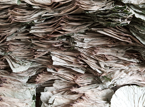 2. 選擇新鮮無痕的荷葉,以葉大、色綠者為佳,除掉葉柄,將荷葉對(duì)折成半圓形,分成大中小三類;