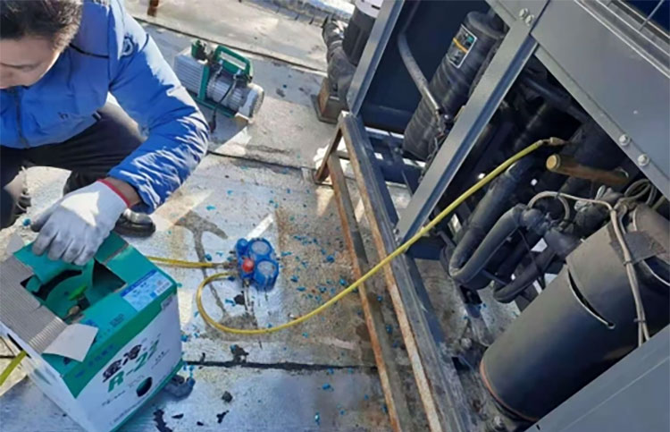 搞清楚了導致出水溫度低的原因之后,我們先排查是否是機組制熱效率下降。先切斷機組與儲水箱的水循環,啟動空氣源熱泵機組,檢測機組制熱能力。若出水溫度達不到銘牌標示最高溫度,則可能為冷媒問題。檢查冷媒工作壓力,對照出廠數據表,若壓力不足,則表現為冷媒丟失,按原型號冷媒充加到出廠標準量即可。如果冷媒沒問題,機組出水溫度仍然低,這時就要考慮是不是換熱器出了問題。