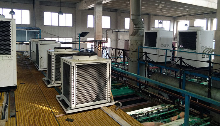 以正旭在山東某電鍍廠的高溫熱水項目為例,該電鍍廠鍍鎳、鍍鉻生產線選用5P、7P、10P、13P共27臺正旭高溫型空氣源熱泵機組,總制熱量達到735KW,完全滿足了其電鍍生產過程中所需要用到的熱水。系統采用氟循環技術,通過鈦管直接與電鍍水進行熱交換,提升了換熱效率,且避免了電鍍水對機組的腐蝕。運行六年多來為電鍍廠節省近千萬元電費,得到了客戶的極力稱贊!